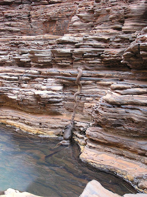 I have an unhealthy obsession with this picture. After staring at it for way too long, I think the snake has a wallaby or small kangaroo--its back legs are much longer than the front and it has a really long tail (still in the water). Maybe this is in Australia or New Guinea.