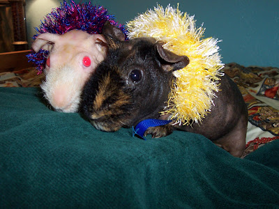 Our favorite pair of hairless guinea pigs * * Harry and Fuzzy * * are back! Sharla and Steven have captured the Aloha spirit of the islands by dressing them up in festive leis. Grass skirts might be in order for the next tour of Hawaii - such nakedness!