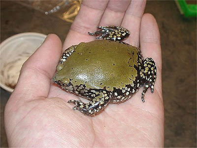 Check out dermatonotus muelleri, better known as Mueller's Termite Frog. I'm having a hard time finding anything out about this amphibian aside from the fact that it probably eats termites. That's a good thing (unless you're a termite). But that bottom photo looks disturbingly like a trio of frogs set in 9x13 pan. I hope there's no casserole planned for dinner.