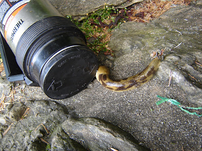 It's a little known fact that banana slugs are coffee fiends. Rick encountered them trying to sneak drinks from his thermos three days in a row. Here is culprit # 3, who was satisfied with licking the dried coffee on the lip of the lid.