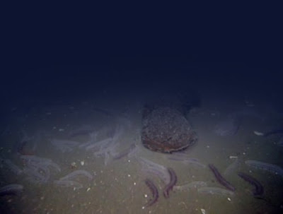 A species of holothurian, Pannychia, swarms a whale fecal mound in the abyssal Paficic.I really don't know what to say about that. It's possibly the best sentence ever written in the English language. And while there's nothing romantic about fecal mounds, it's nice to think that even such an unlikely item can bring communities (even of the sea cucumber variety) together. Isn't the world a beautiful place?