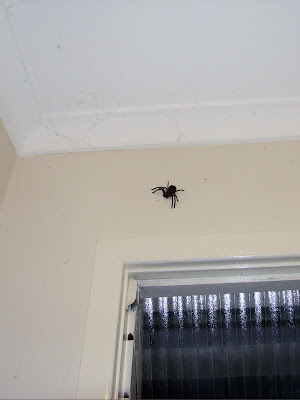 Bonni needs your help. She encountered this spider (see the lower picture for scale) above her toilet in Australia. Do you know what kind of spider it is? She says the abdomen is the size of a large grape, which is enough to make me swear off grapes until they get below $1.99 a pound again.