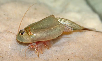 The triops is a hermaphroditic crustacean (males are very rare--a good thing for you misandrists), and is a temporary pond-dwellers. They lay eggs in these ponds, and when the ponds dry up, the eggs remain in a state of suspended animation until filled back up. Want a triops? Just take eggs and add water. Think sea monkeys.