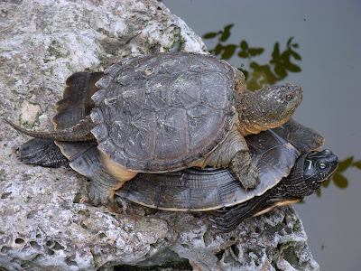 Here we have a terrapin fulfilling the role of a basking rock for a juvenile snapping turtle. See? Fuzzy animals don't have a monopoly on cuddling. Wait, this has stumbled across the border from ugly to cute. Sorry about that. Maybe it's this need I'm feeling right now to go home and snuggle with my tortoise. But then I'd have to change my clothes after Jack squirted me with his wonderful blend of feces and urea. Never mind. Cuddly feelings gone.